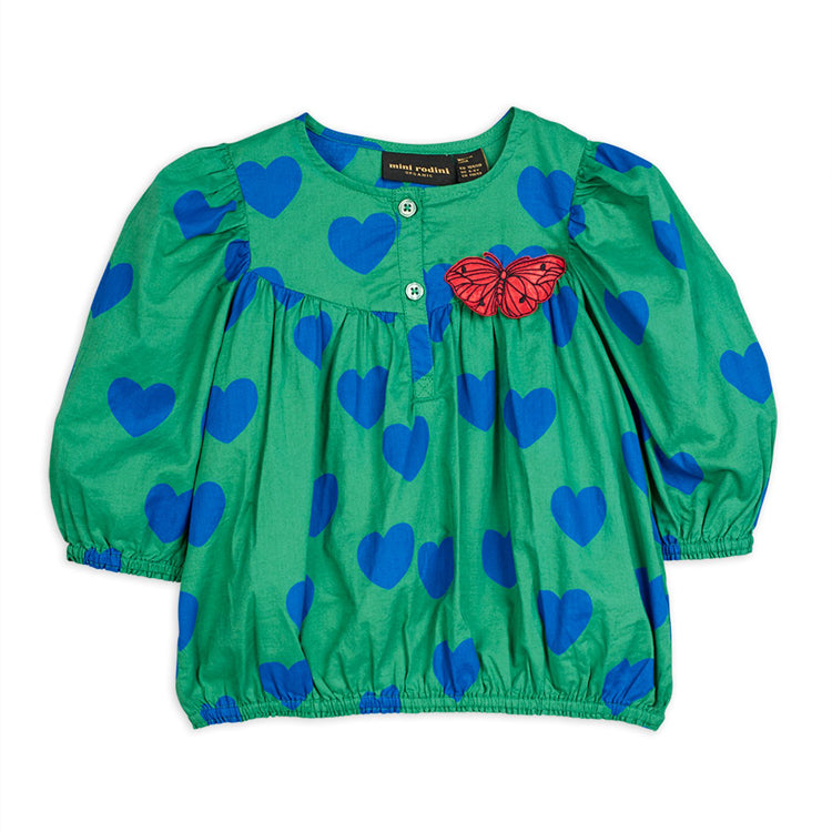 This green blouse is crafted from airy organic cotton voile with hearts printed all-over. It has a voluminous silhouette featuring a half button-up front and elasticated balloon sleeves and hem. A butterfly patch made from upcycled polysatin decorates the chest.