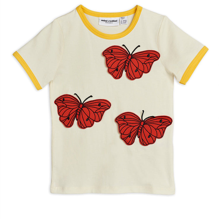 This classic white T-shirt in stretchy organic cotton jersey is updated with yellow trims and butterfly patches in upcycled polysatin with loose wings for a dimensional look.