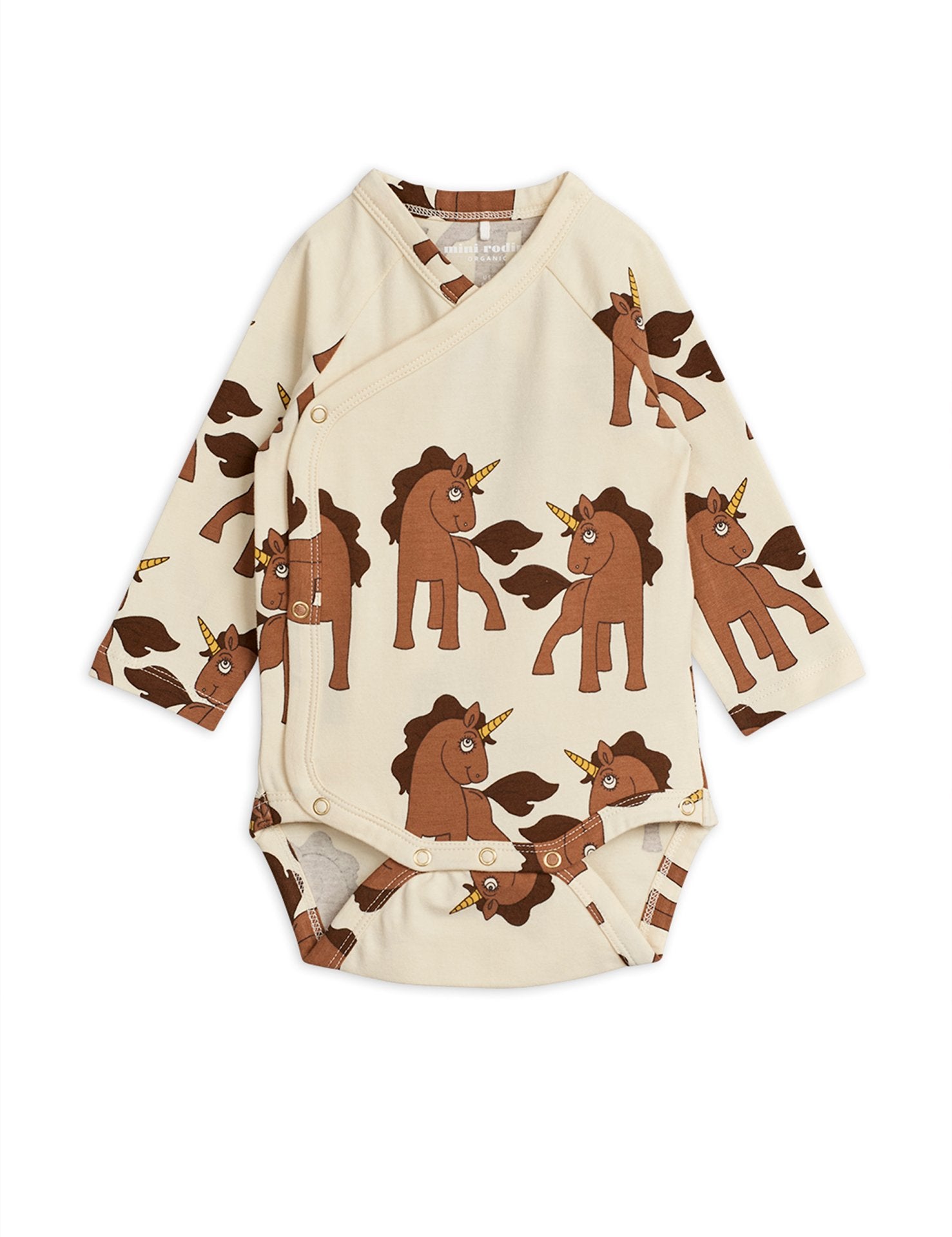 Printed unicorns pattern this wrap body crafted from organic cotton jersey with a touch of stretch. The long-sleeved wrap body is Mini Rodini¡¯s newborn-model, designed to make dressing sessions easier. The snap buttons at the front and crotch make it easy to wrap the garment around the child, instead of pulling the garment over the head. If you're in between sizes, we recommend you to choose the smaller size for a better fit.