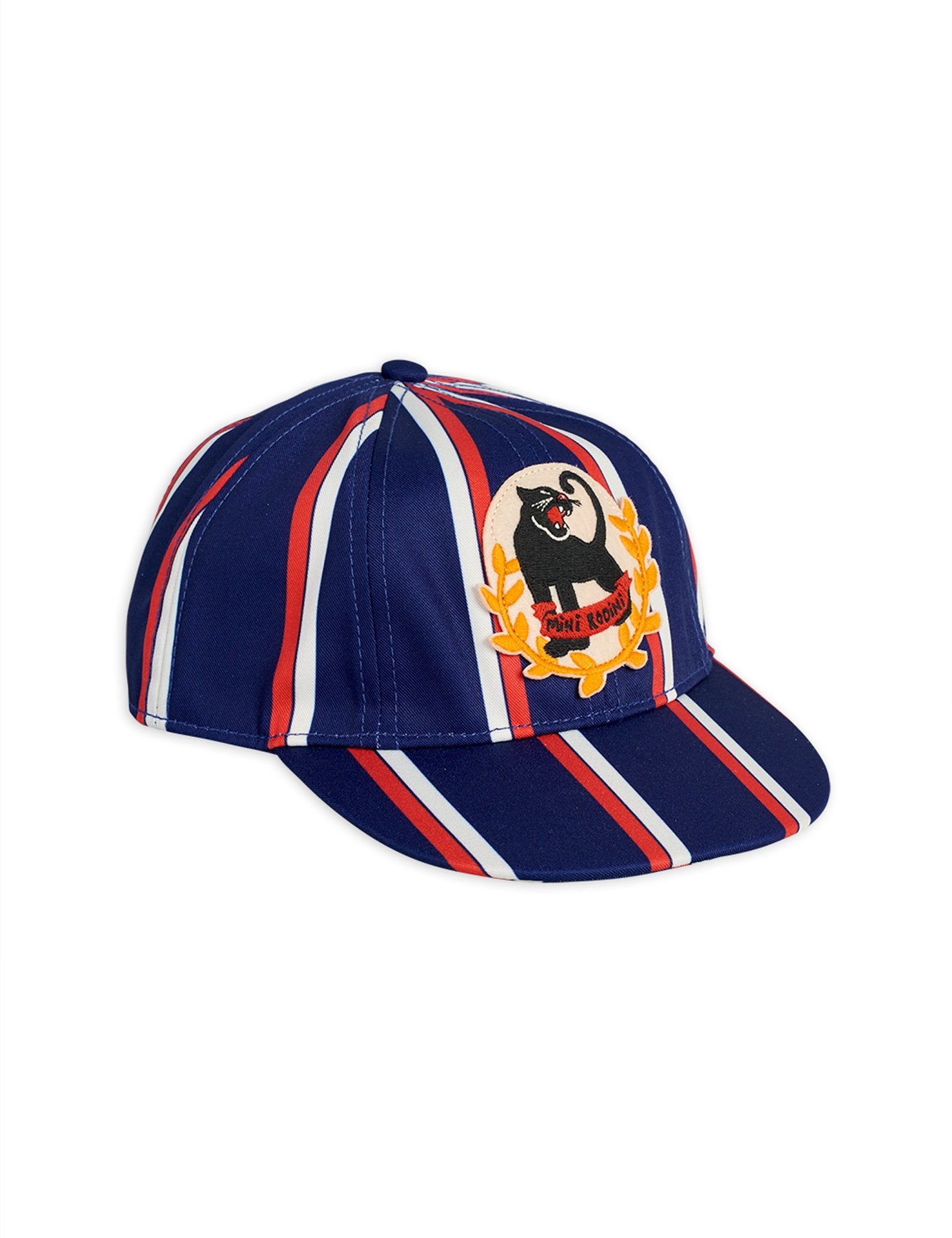 This blue striped cap has a flat visor. It is decorated with a panther emblem at the front. A soft elastic at the back keeps the cap in place.