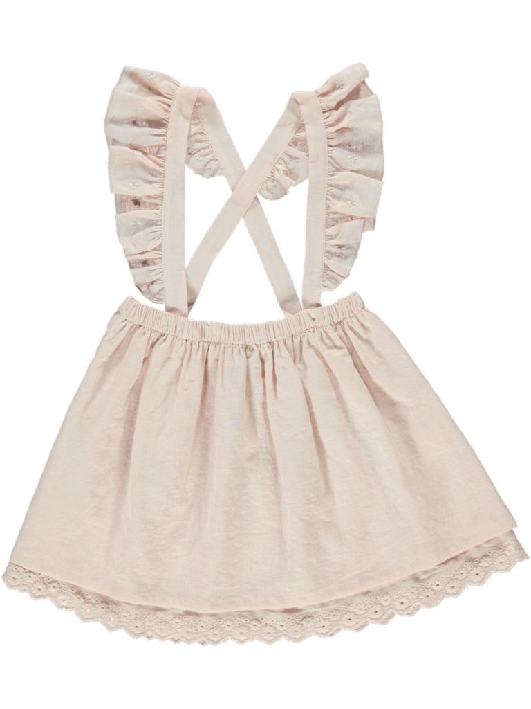 For the savvy little dresser who loves to create winning ensembles, this cute skirt will be a big hit. Featuring a full, flouncy skirt, an elasticized waist, ruffled straps that cross in the back and signature cotton lace at the hem line. This sweet skirt pairs beautifully with a Lydia blouse and transitions effortlessly from season to season. Ingrid skirt comes in old pink and taupe colour options.
