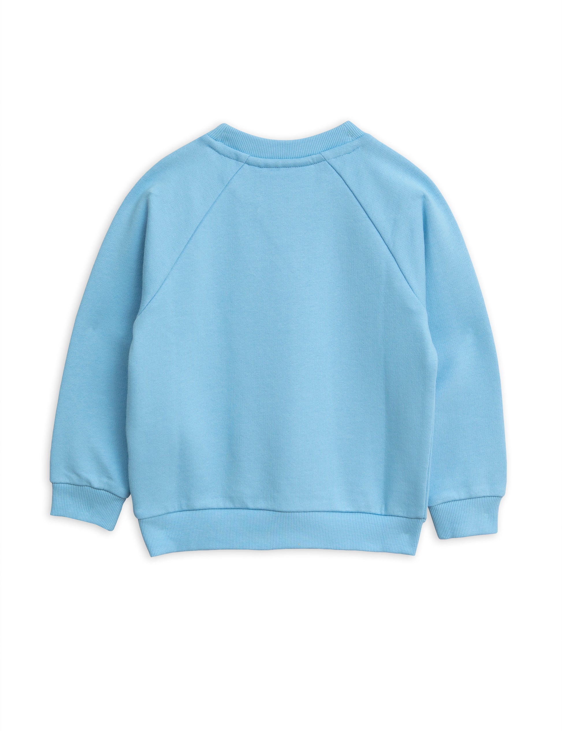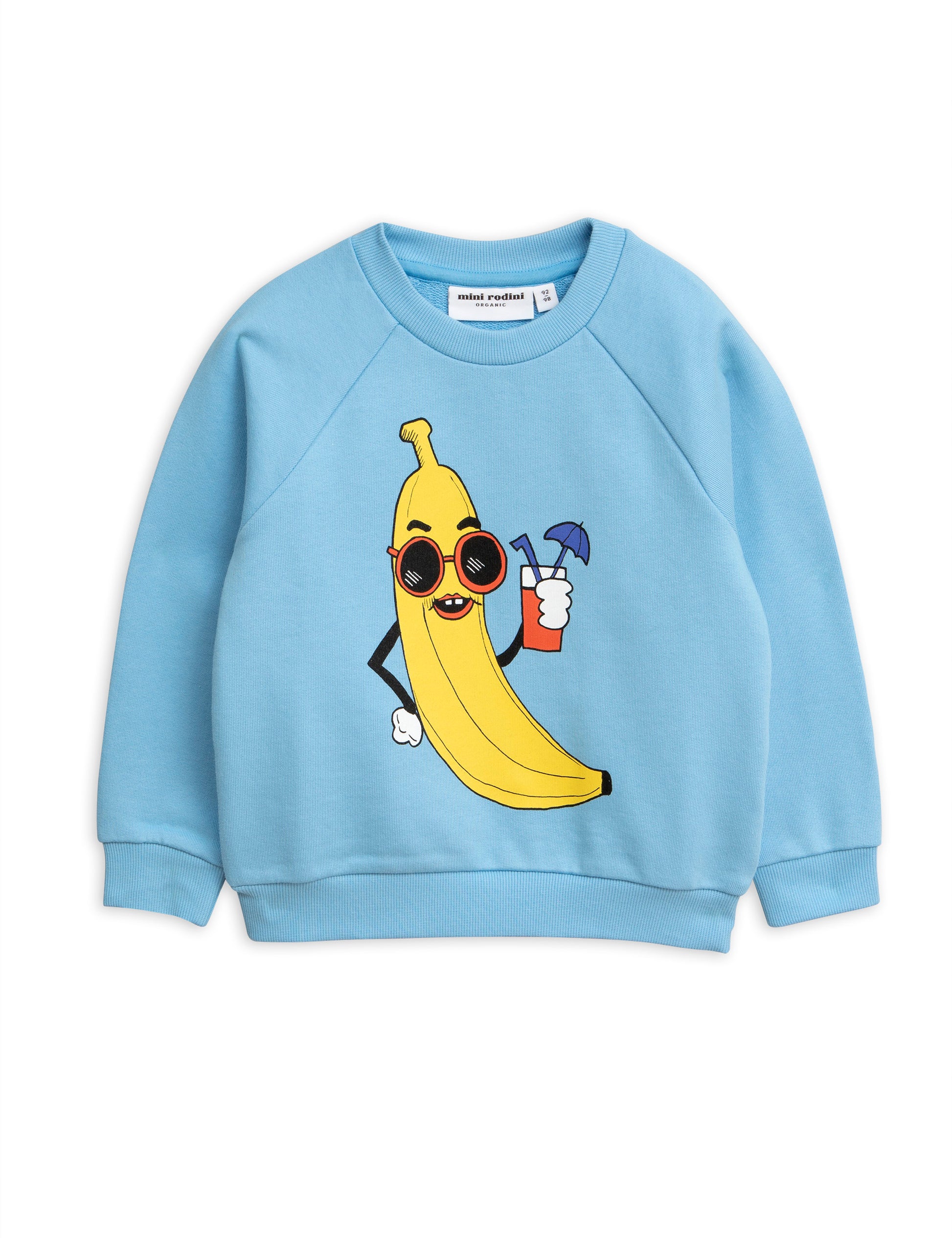 Light blue sweatshirt crafted from 100% GOTS certified organic cotton with a terry underside. This looped fabric is easy to care for, keeps shape and has moisture-wicking properties to keep the skin dry. The sweatshirt has raglan sleeves and is detailed with a screen printed summery banana at front. Ribbed trims at neck, cuffs and hem complete the style.