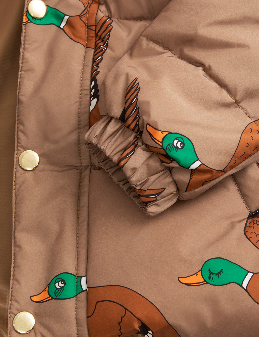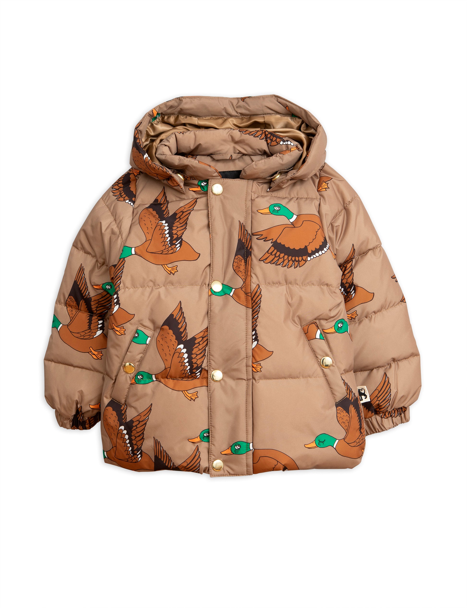 In brown with a flying duck print, this lightweight puffer is made from recycled polyester. The jacket has a warm, down touch padding and a breathable and a water-resistant shell fabric with a BIONIC-FINISH?? ECO coating. Designed with a snug hood and elasticated cuffs to prevent wind and snow from getting in.