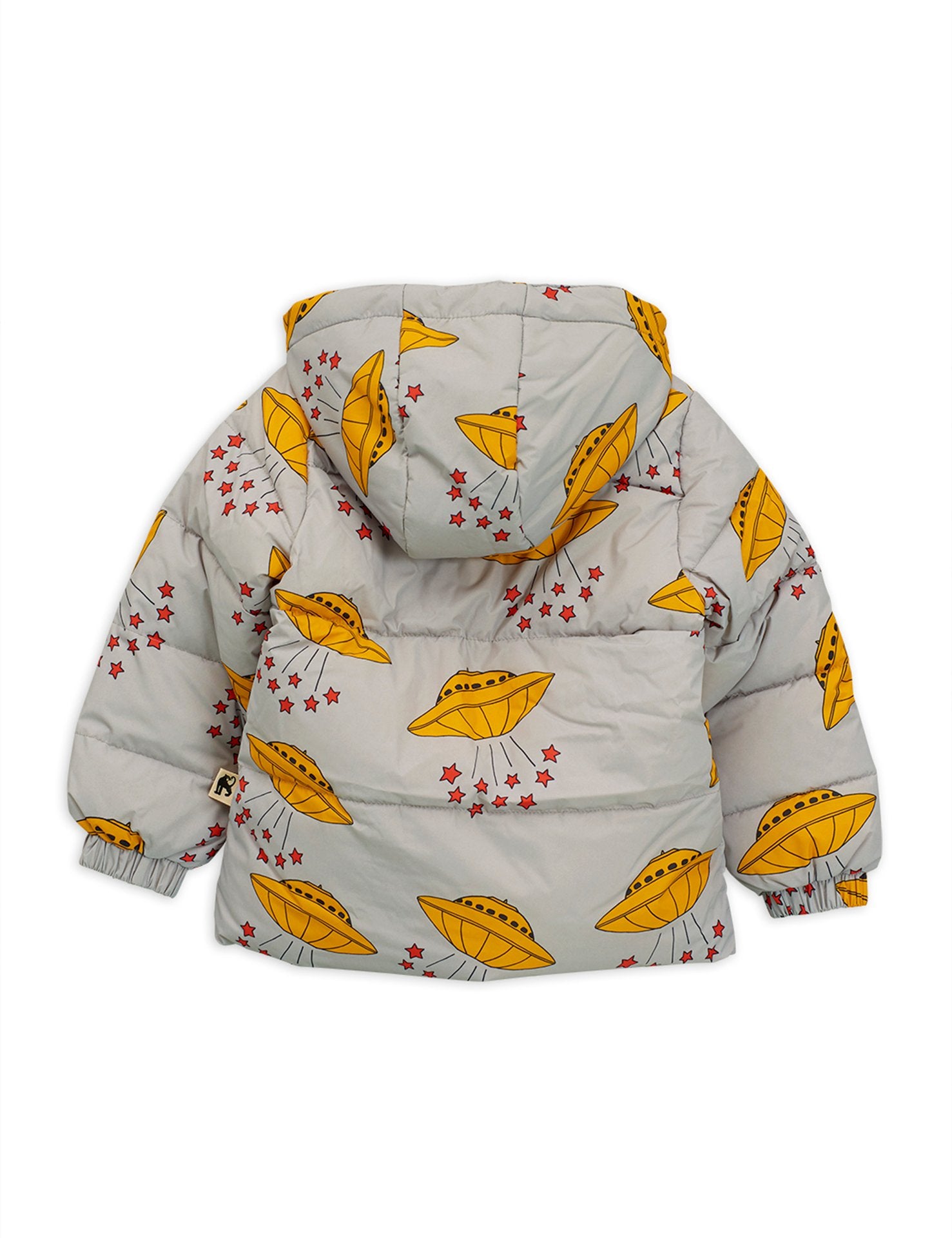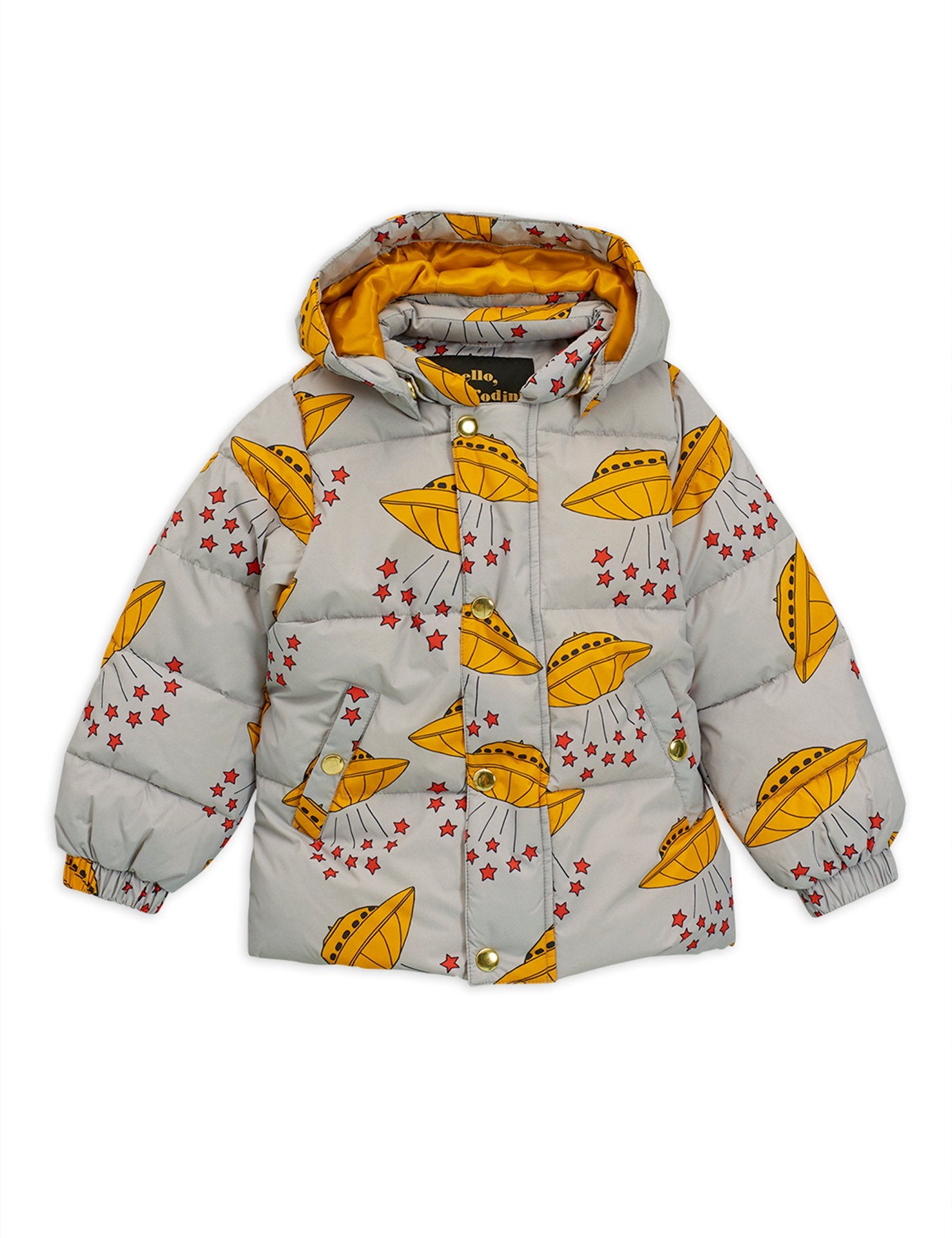 In grey with a yellow UFO print, this lightweight puffer is made from recycled polyester. The jacket has a warm, down touch padding and a breathable and a water-resistant shell fabric with a BIONIC-FINISH? ECO coating. Designed with a snug hood and elasticated cuffs to prevent wind, and snow from getting in.