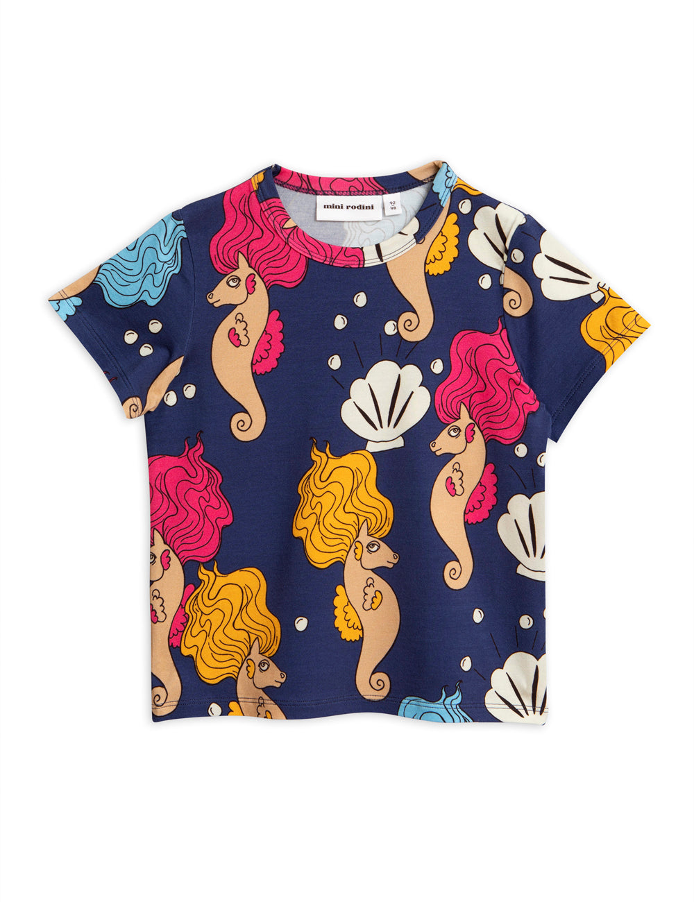 This dark blue t-shirt is crafted from TENCEL Modal with added stretch for a smooth feel and comfort. Printed with colourful seahorses, it has a straight fit and a neat finish.