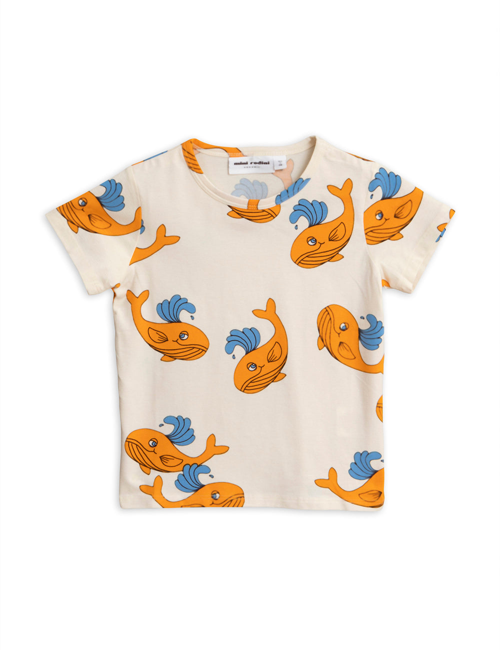 A soft off-white t-shirt in GOTS certified organic cotton jersey with comfort stretch and an all-over orange whale print. This t-shirt has a classic straight fit and a ribbed neck.