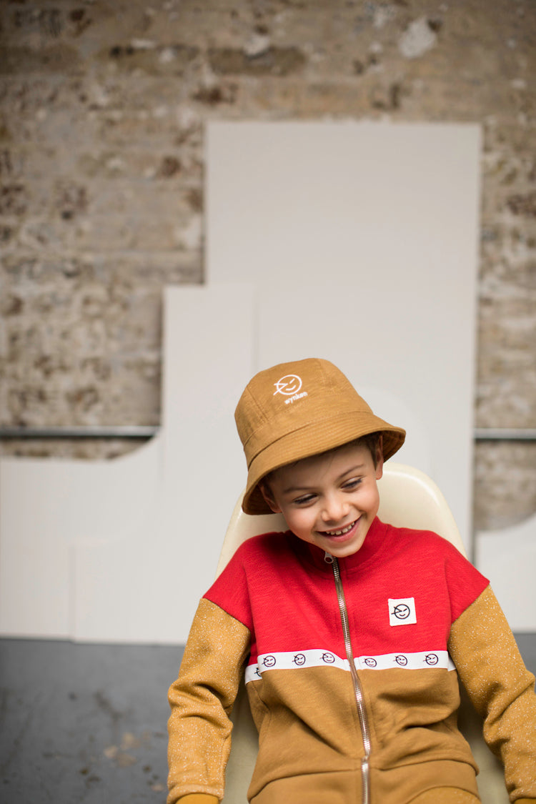 A Bucket Style Hat Made From Soft Cotton Terry Towelling In Blue With Central Panel And Hat Band Above Brim. On The Front Of The Hat Is An Embroidered Wynken Logo In Off White With Wynken Font Underneath.