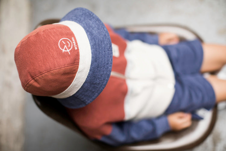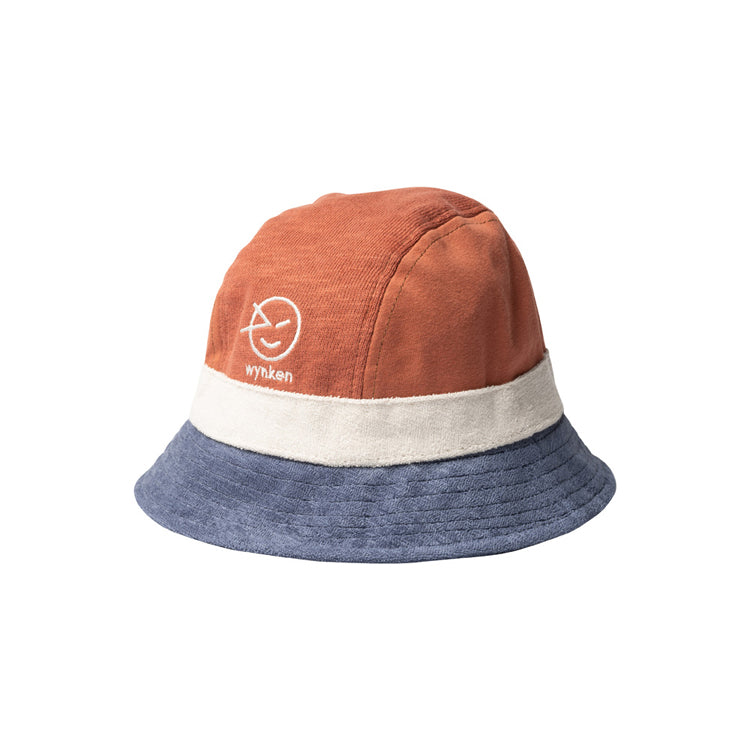 A Bucket Style Hat Made From Soft Cotton Terry Towelling In Blue With Central Panel And Hat Band Above Brim. On The Front Of The Hat Is An Embroidered Wynken Logo In Off White With Wynken Font Underneath.