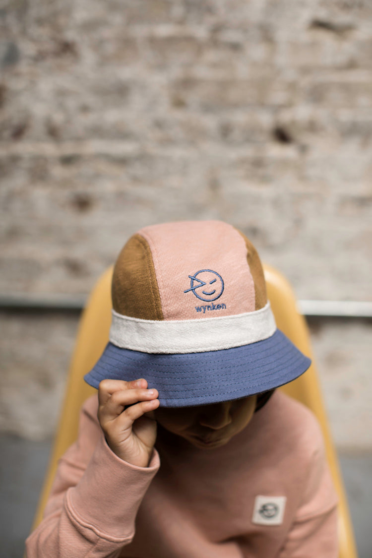 A Bucket Style Hat Made From Soft Cotton Terry Towelling In Blue With Central Panel And Hat Band Above Brim. On The Front Of The Hat Is An Embroidered Wynken Logo In Off White With Wynken Font Underneath.