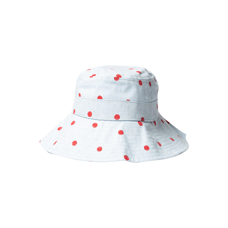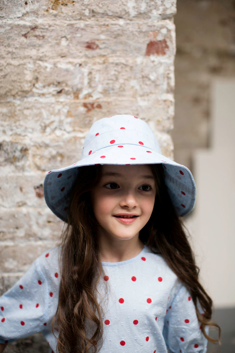 Our Wide Brim Hat A Large Brim To Keep Off The Rays Of The Sun, It Is Made From A Lightweight Blue Cotton Fabric With A Dot Texture And Then Printed With Our Red Dot Print. Double Dots!