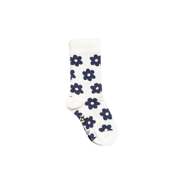 A Ankle High Sock Knitted In White With Small Navy Flowers. The Sole Has A Branded Wynken Logo With The Size Of Sock.