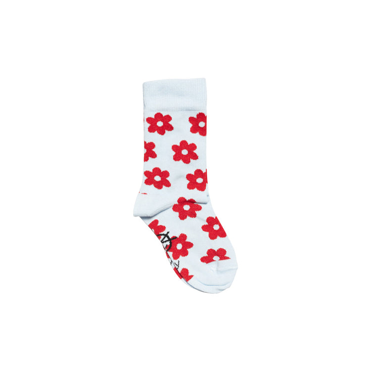 A Ankle High Sock Knitted In White With Small Navy Flowers. The Sole Has A Branded Wynken Logo With The Size Of Sock.